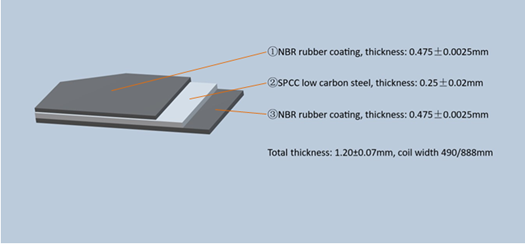 Cold-rolled steel coil with different thickness of NBR rubber coating on both sides by advanced technology according to customers’ requirement.